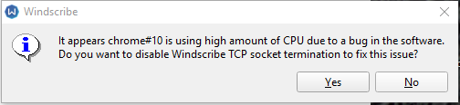 For this reason, we updated the Windscribe app to still close the sockets as it did before but also to monitor CPU usage to see if there was a significant spike after making a VPN connection. If that happens, the warning below will come up telling you that an application or service on your PC is using a high amount of CPU and it could potentially be due to the fact that we closed its TCP socket.